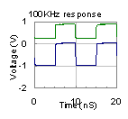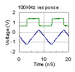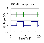 つぎの表は実際のフラットアンプアンプ3種の過度応答の測定例です。上の緑色の線が入力波形で下の青色の線が出力波形です。アンプの(1)は基本波の100KHzに対して十分に周波数特性が伸びておりかつピークもない理想的な矩形波応答波形です。(2)のアンプは高域が比較的早く減衰しているため高調波が出力されないので三角波のような応答波形になっています。(3)のアンプは位相補正を行っていないために基本波の数十倍の周波数で4dB程度のピークがあるアンプです。矩形波応答にも高域のピークの影響が現れています。