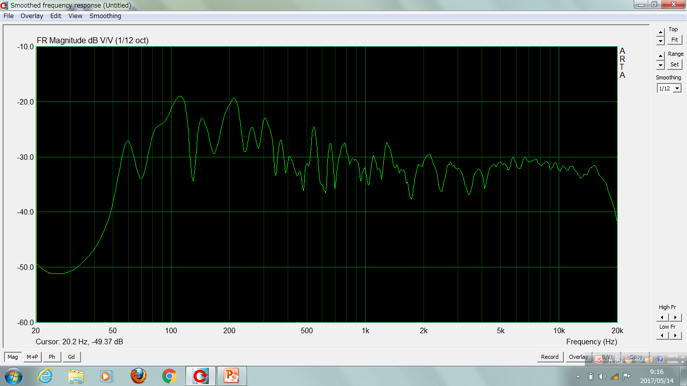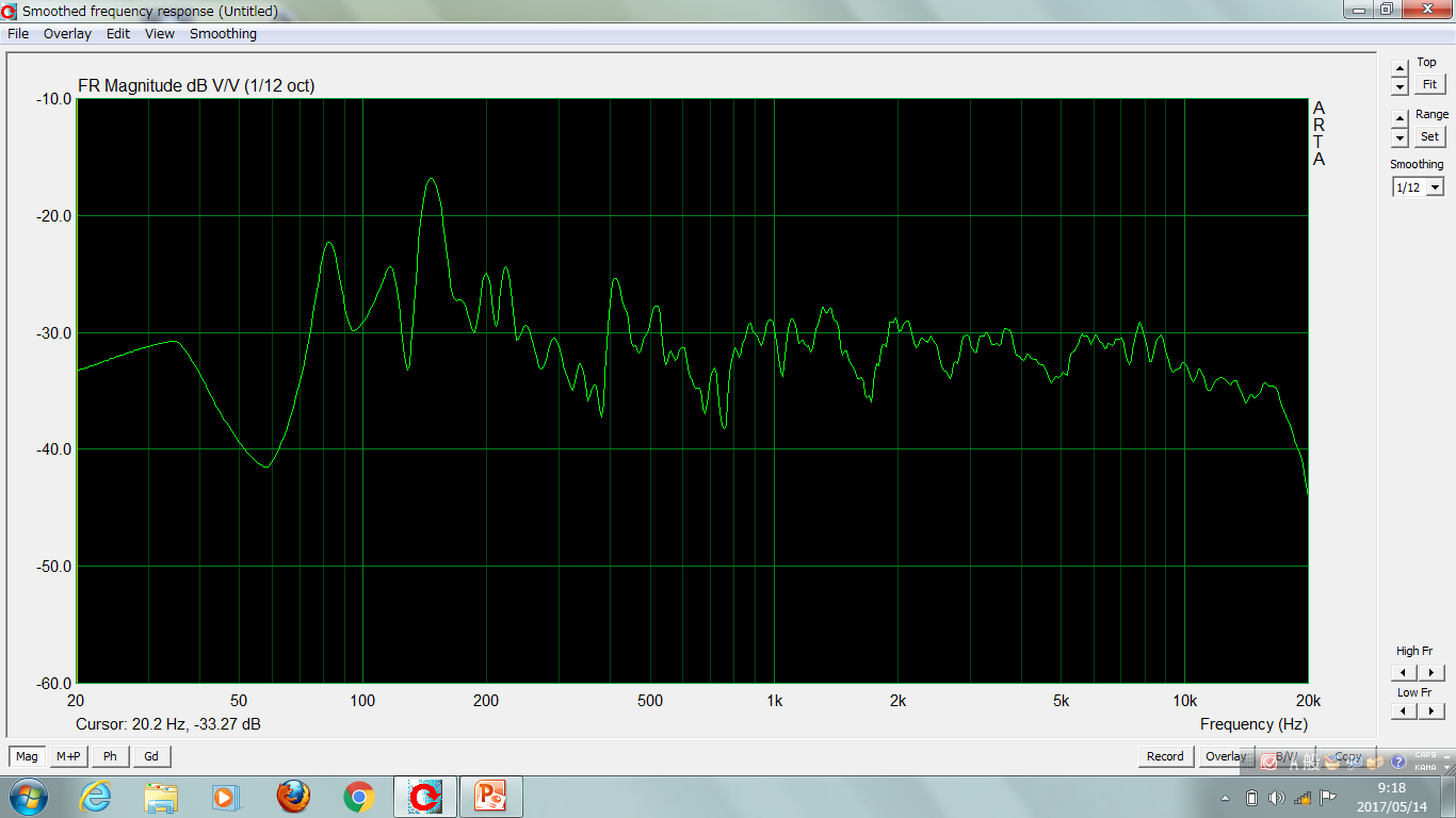 一応この部屋での周波数特性を測ってってみました。時間がないのでササッと測ったものなので見栄えは今ひとつです。聴感上との相関はというと・・・うーん、よくわかりません。
