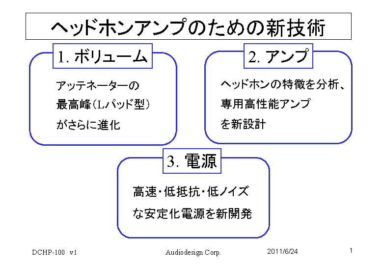 それとスライドにはしませんでしたが、電源には高速、低ノイズ、低インピーダンスの安定化電源を採用しています。この電源は通常アンプに使用される電源よりも一桁向上している優れもので、DCアダプターとして別売しているくらいです。