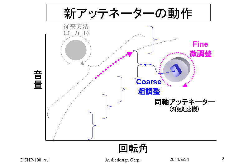 内側のツマミで使用領域を設定し、外側のツマミで微調整を行うという2段階になっています。従来のボリュームがゴーカートのアクセルとすれば今回のアッテネーター5段変速付きのアクセルと例えることができます。