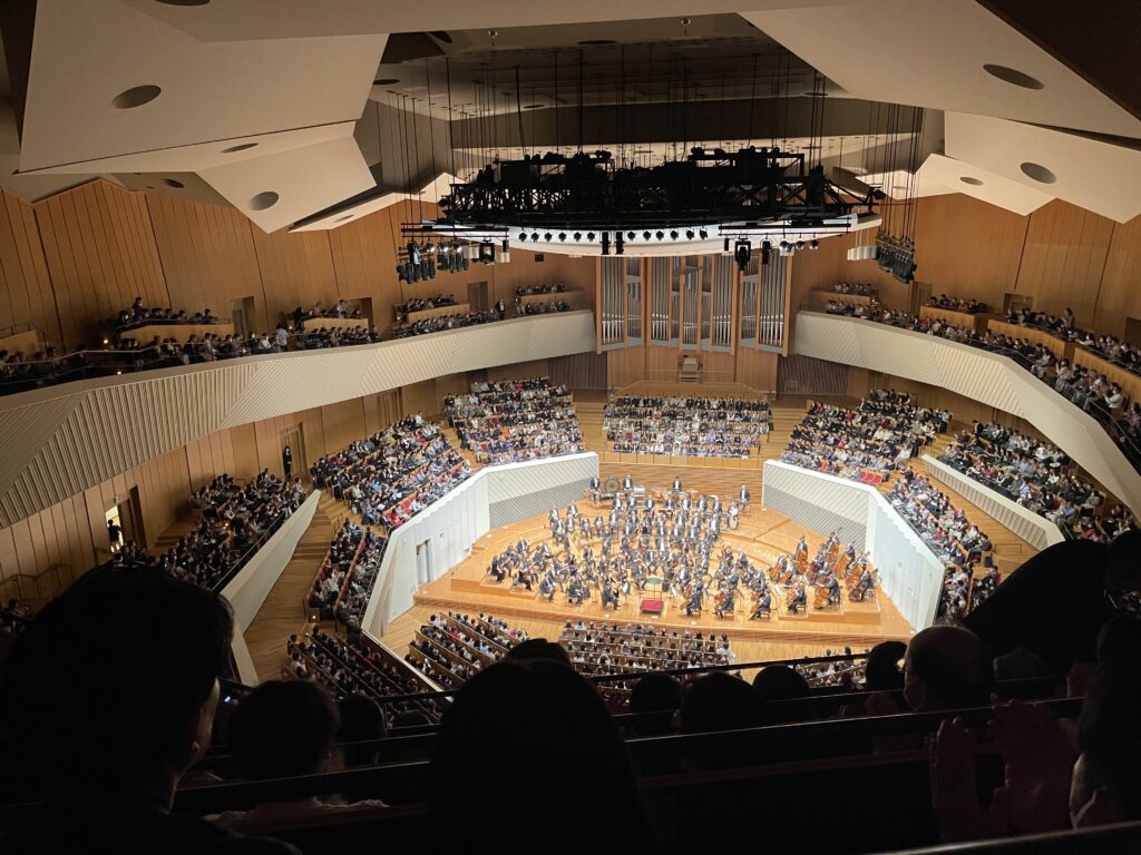 このホールは分類すればアリーナ型(後方も開けている)でサントリーホールと同じですが、かなり周囲を絞っているというか、すり鉢状になっているのでサントリーホールの様に音がすかすかになる事はないと思います。もう少し前の方で聴ければ最高の音質だったでしょう。