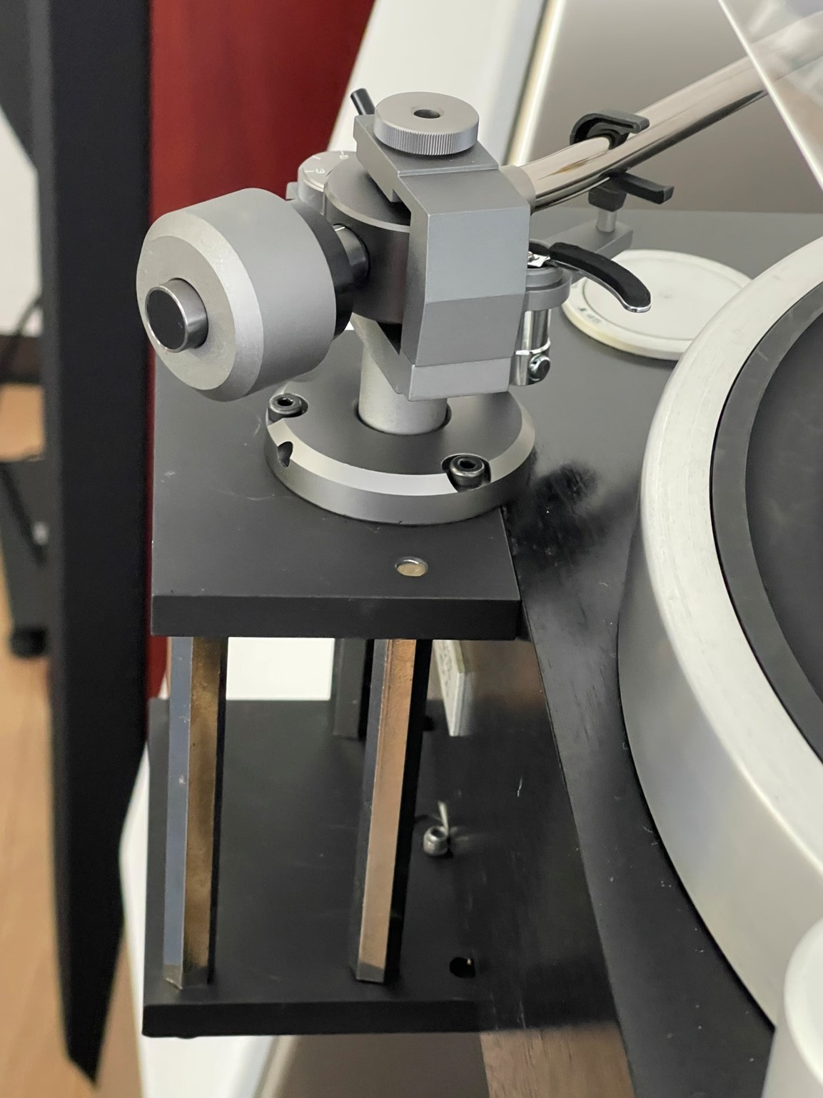このアームを追加するために、プレーヤーの左側にアームベースを自作して取り付けました。ヤマハGT-2000はターンテーブルが通常のレコード盤より大きいため、アームをターンテーブルに近づけて設置する必要があり、アームベースがプレーヤーの台からせり出すような形になりました。