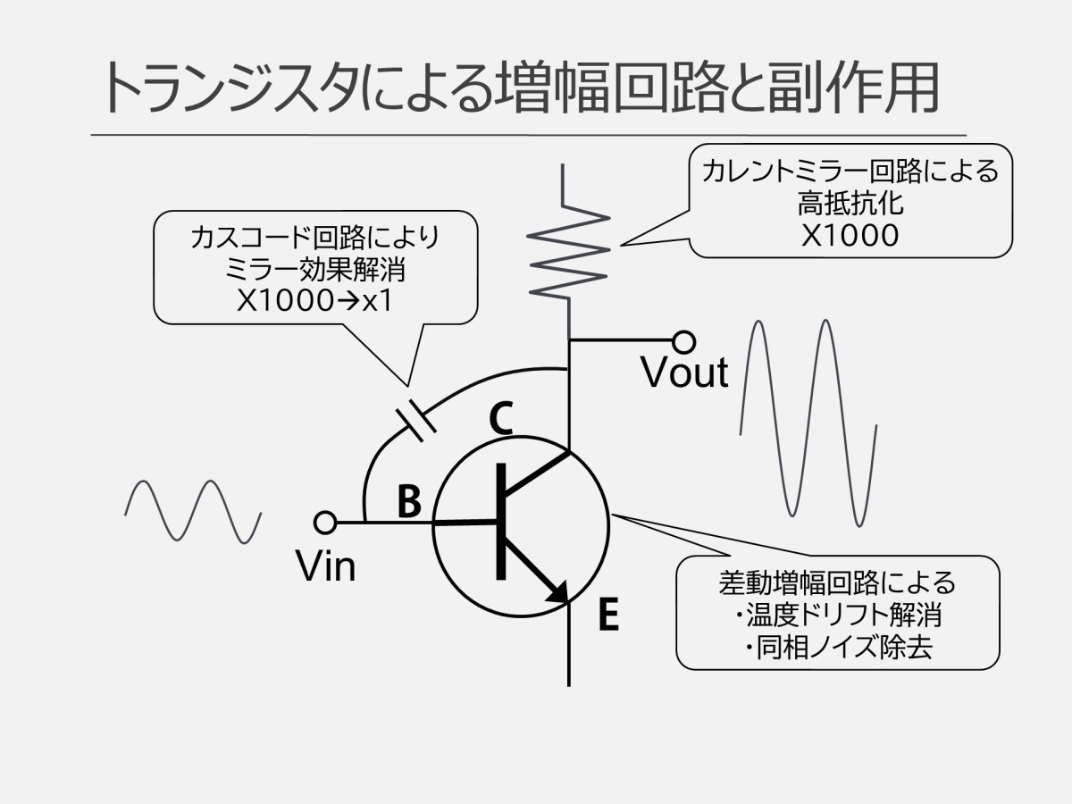 トランジスタには、入力端子と出力端子の間に寄生容量(意図せず発生するコンデンサ成分)が存在します。これが原因で、増幅段で電圧が増幅される際に、この寄生容量が何百倍にも見かけ上増大する現象(ミラー効果)が発生します。