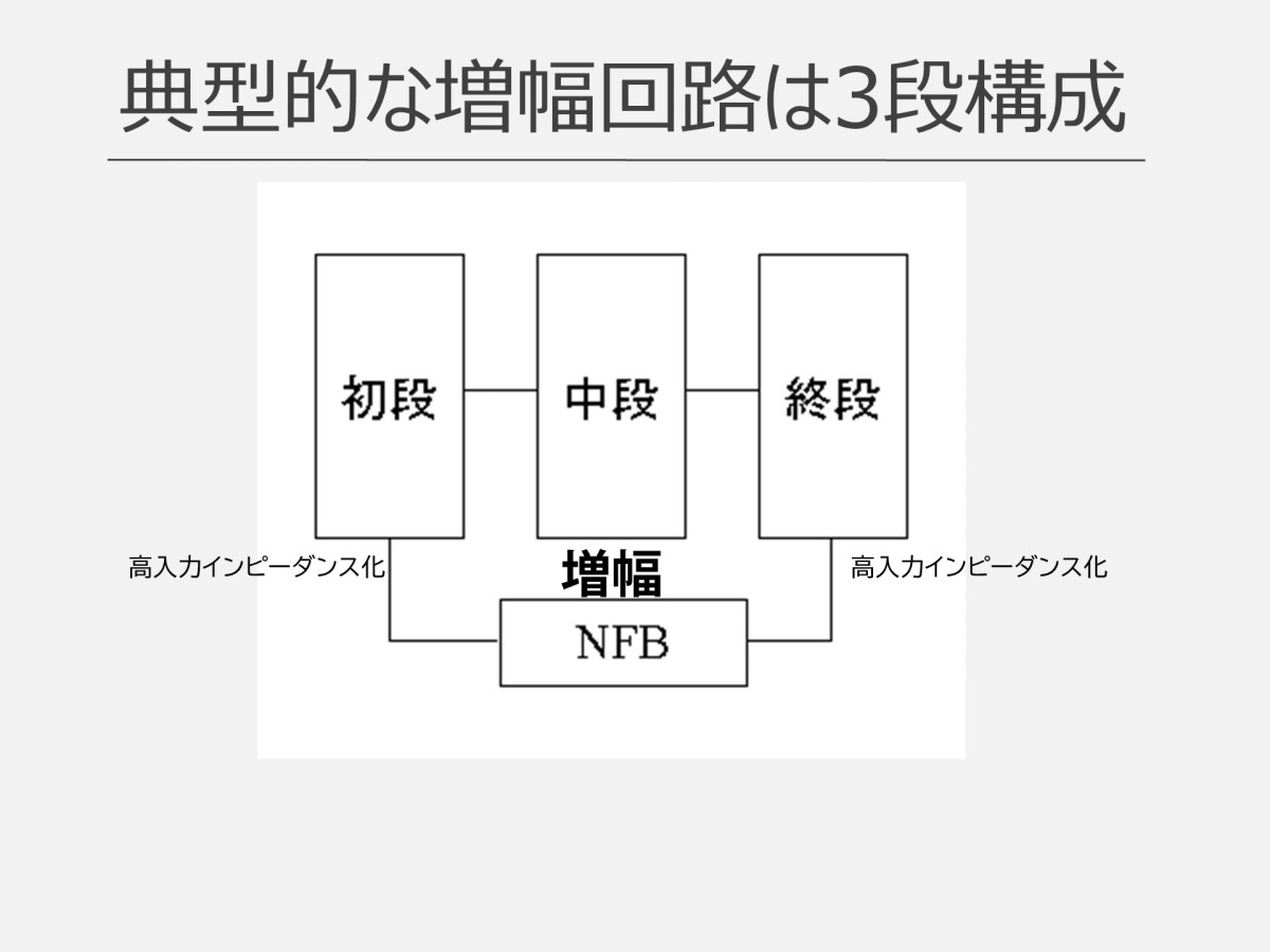このうち、信号の増幅(ゲインの獲得)において主要な役割を果たすのは中段です。初段と終段は、中段が増幅を理想的に行うためのお助け役としての役割を担っています。