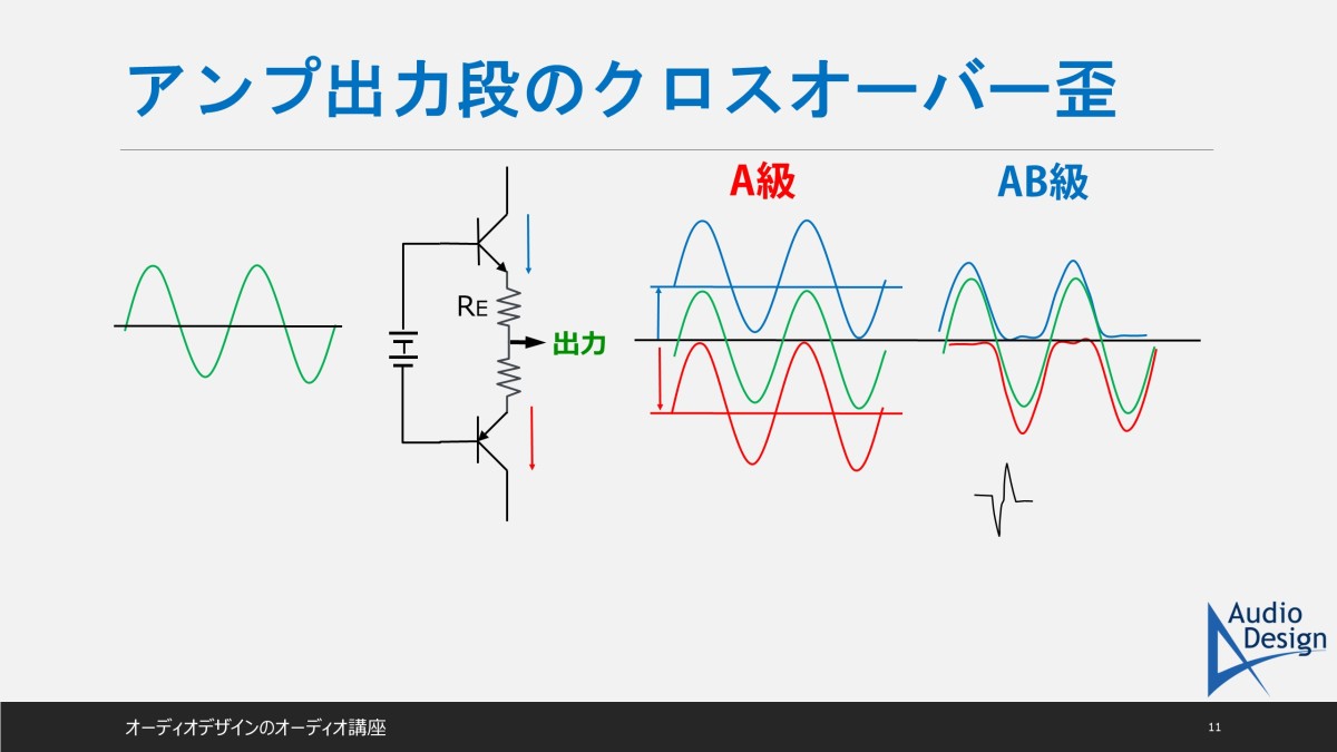 AB級アンプの音質上の欠点として挙げられるのが、トランジスタがオン/オフを切り替える際に発生するパルス性のノイズ(クロスオーバー歪み)です。