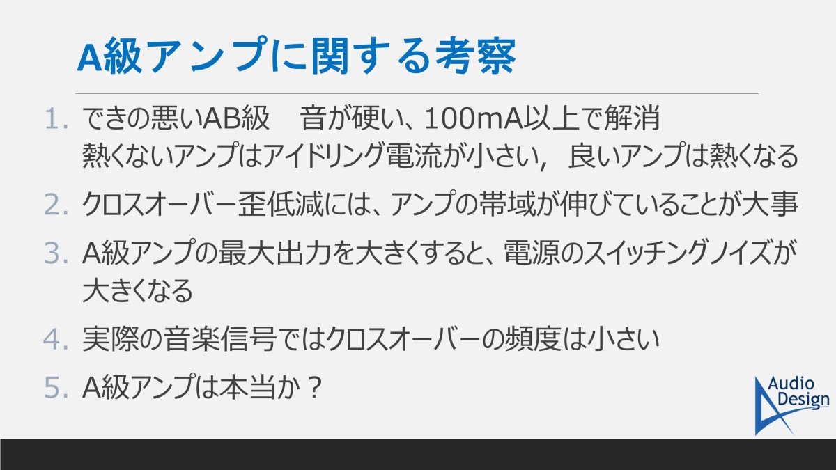近年のアンプには、「A級アンプ」と称されていても、厳密には全動作領域がA級ではないものがあることにも注意が必要です。