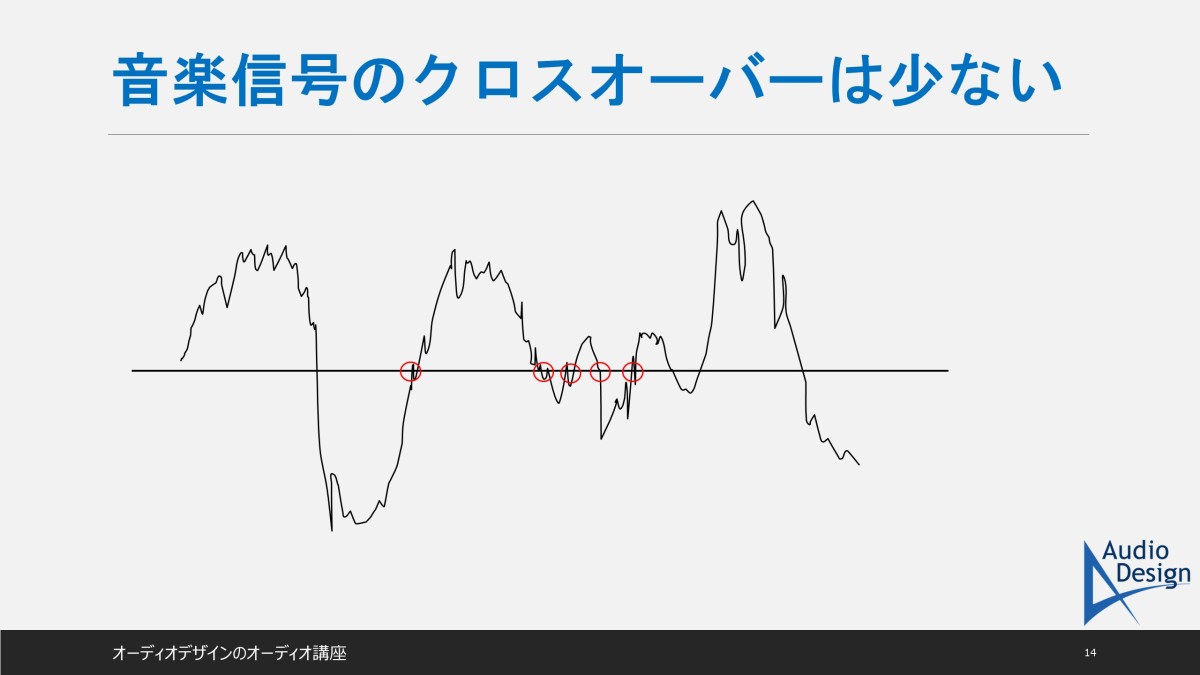 実際の音楽信号を再生する際、低音楽器などの振幅が大きい信号成分があるため、信号がゼロ点を横切るクロスオーバーの頻度は意外と小さいのです。