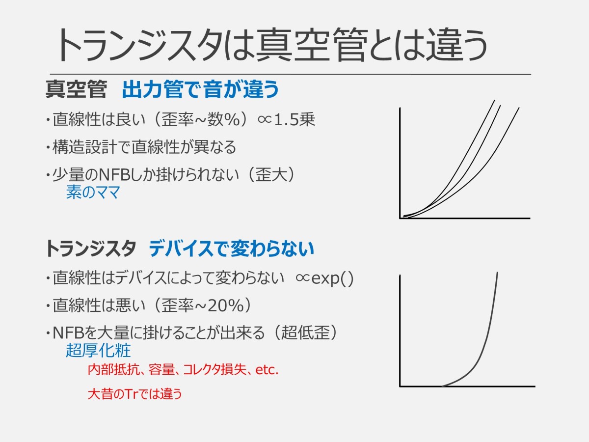 つまり、トランジスタアンプの音は個々のトランジスタが持つ「素の音」ではなく、アンプ回路全体でその特性を打ち消す(NFB)という設計手法、いわば「超厚化粧」によって作り上げられているのです。